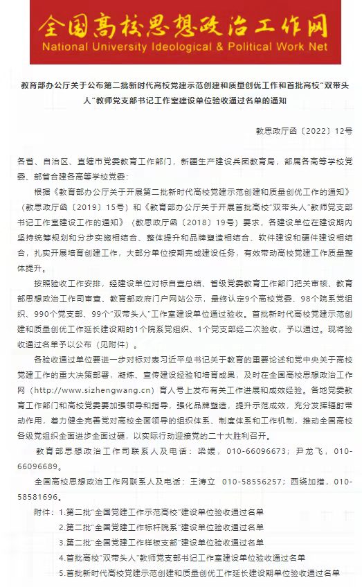 近日,教育部办公厅公布了第二批新时代高校党建示范创建和质量创优工作验收通知(教思政厅函【2022】12号),beat365在线体育官网登录入口计算机科学与技术学院本科生第一党支部顺利通过验收。计算机科学与技术学院本科生第一党支部于2019年12月,经学校推荐、省委教育工委评审、教育部审批,获评第二批“全国党建工作样板支部”培育创建单位,全国共有999个党支部获得创建资格。经过两年的建设,共有990个支部顺利通过验收。