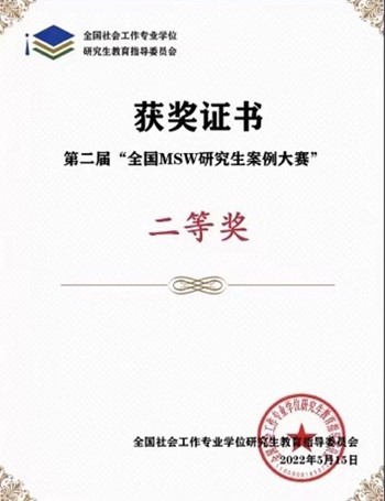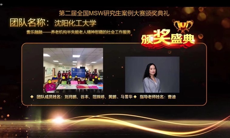 5月15日,第二届“全国MSW研究生案例大赛”决赛暨颁奖典礼在线上举行,beat365官网人文与艺术学院的曹迪副教授指导、社会工作专业研究生刘月鹏、谷丰、范姝婷、黄鹏、马雪华共同完成的案例《耆乐融融——养老机构半失能老人精神慰藉的社会工作服务》荣获二等奖的好成绩。