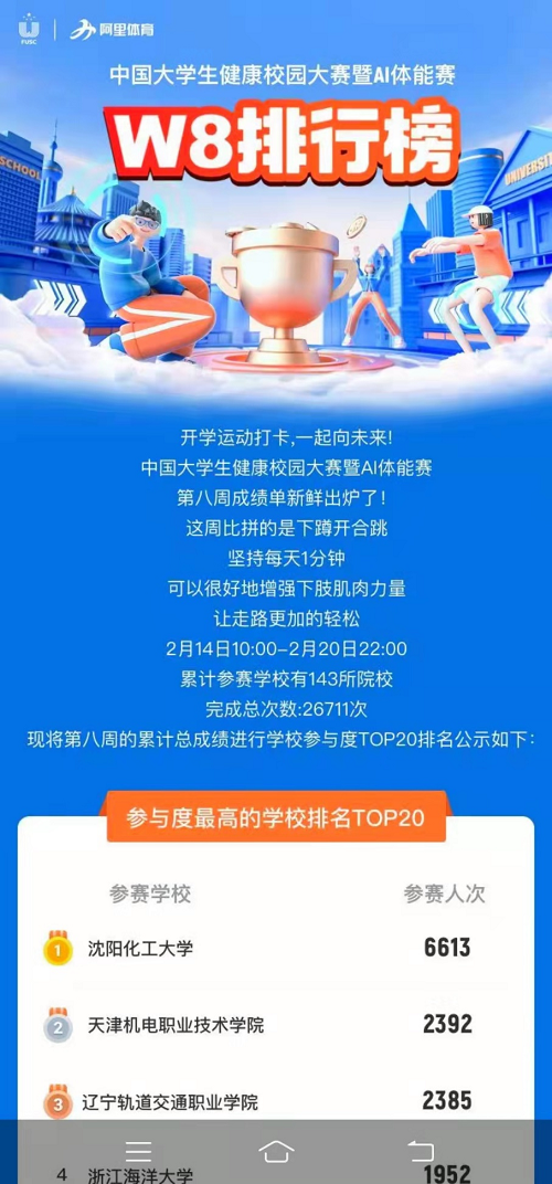 为增强大学生体质健康,培养大学生锻炼习惯,中国大学生体育协会和阿里体育有限公司联合承办了中国大学生健康校园大赛暨AI体能赛,比赛日期为2021年12月13日至2022年6月5日。由于时间跨度较长,比赛分两个时间赛段,以2022年3月27日作为时间节点,第一阶段为15周,第二阶段10周。比赛有以学校为单位的团体赛,也有个人的排名赛,在个人赛中,每周比赛的全国第一名男、女学生都会评为“运动之星”。