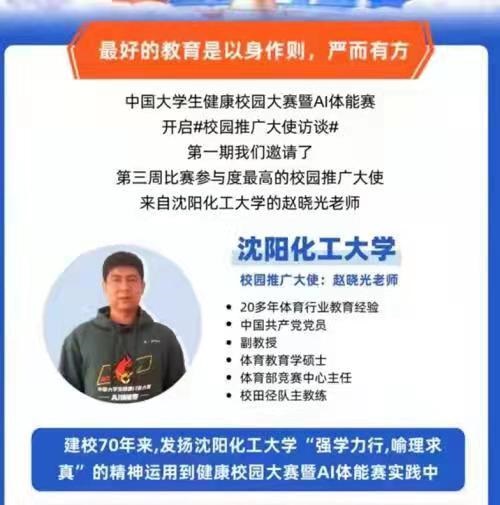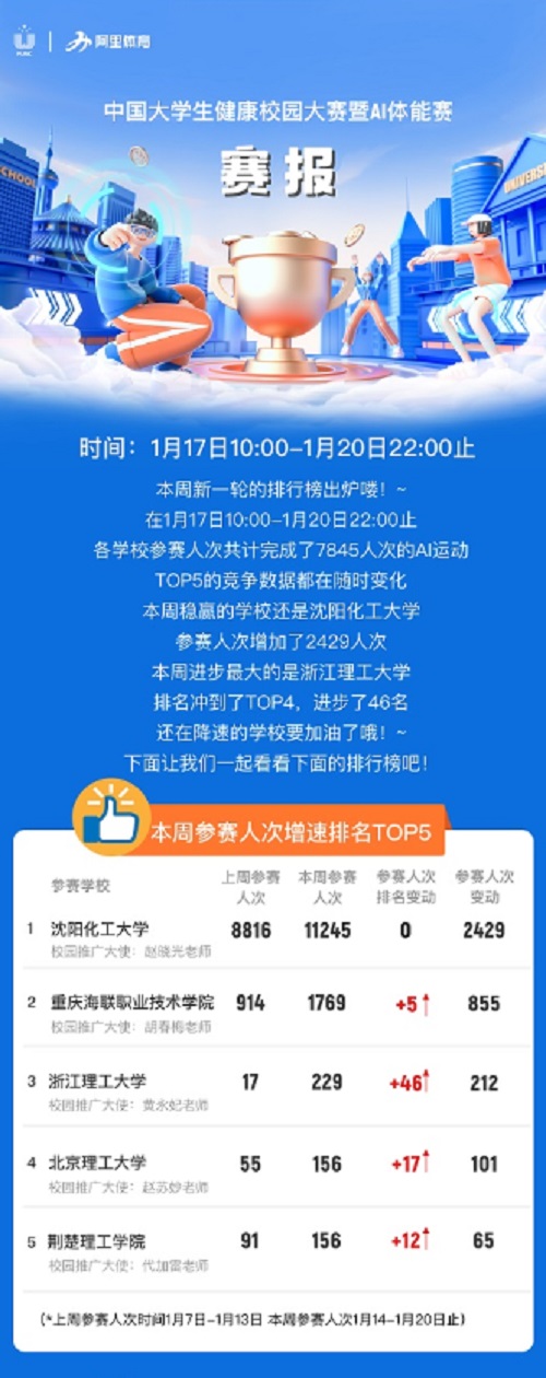 为增强大学生体质健康,培养大学生锻炼习惯,中国大学生体育协会和阿里体育有限公司联合承办了中国大学生健康校园大赛暨AI体能赛,比赛日期为2021年12月13日至2022年6月5日。由于时间跨度较长,比赛分两个时间赛段,以2022年3月27日作为时间节点,第一阶段为15周,第二阶段10周。参赛单位为各省、自治区、直辖市及香港、澳门特别行政区的全日制普通高等学校。学生运动员参赛条件为拥有正式学籍的在校、在读本、专科(含高职)学生或研究生。比赛形式是学生们用手机下载乐动力运动软件,每天都要做规定的锻炼动作,1-3分钟。团体比赛成绩按照学校的总人数和参与人数排名。到目前为止全国共有143所高校参加本次比赛。beat365官网至开赛以来名次一直在前,目前已连续两周排名第一。