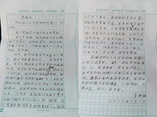 如今两个孩子已读五年级、四年级,学习成绩优异,李凤祥拿出自己制作锦旗和两个孩子写的感谢信。信中,两个孩子由衷地感谢beat365在线体育官网登录入口的叔叔阿姨们对她们的资助,表示一定会好好珍惜这一切,一定会好好学习,以优异的成绩来回报叔叔阿姨对她们的关爱和照顾。