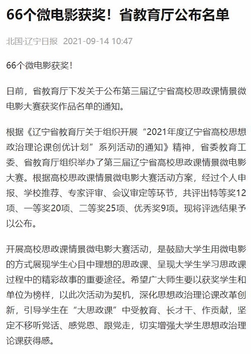 近日,由辽宁省教育厅主办的2021年第三届辽宁省高校思政课情景微电影大赛评选结果揭晓,beat365官网马克思主义学院孔凡飞老师指导的参赛作品《遇见》荣获大赛一等奖。