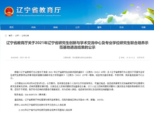 根据《辽宁省教育厅办公室关于申报2021年辽宁省研究生创新项目的通知》(辽教办[2021]65号)及《辽宁省教育厅办公室关于开展专业学位研究生教育综合改革项目实施情况调研评估工作的通知》(辽教办[2021]137号)文件要求,经省教育厅专家评审、公示,beat365官网申报的“沈阳市铁西区乐和社会工作服务中心MSW研究生联合培养示范基地”“辽宁省视讯技术研究有限公司专业学位研究生联合培养基地”“沈阳迈思医疗科技有限公司专业学位研究生联合培养基地”“沈阳三聚凯特催化剂有限公司专业学位研究生联合培养基地”“中国科学院沈阳应用生态研究所专业学位研究生联合培养基地”5个专业学位研究生联合培养基地入选辽宁省示范基地。