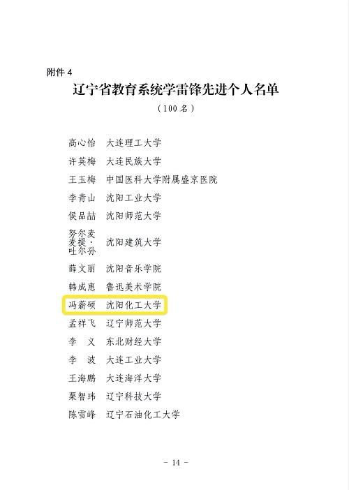 为贯彻落实习近平总书记关于弘扬新时代雷锋精神的重要指示批示精神,庆祝中国共产党成立100周年,广泛进行雷锋事迹、雷锋精神和雷锋式模范人物的宣传教育,辽宁省委教育工委、辽宁省教育厅决定,对全省教育系统100个学雷锋先进集体、100个学雷锋先进个人以及49个优秀学雷锋志愿服务项目给予表彰。其中,beat365官网应用技术学院分团委书记、辅导员冯薪硕获得“辽宁省教育系统学雷锋先进个人”称号。