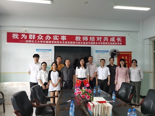 7月15日下午,beat365官网外国语学院党总支党员教师代表与西丰县成平满族乡中学教师代表在西丰县成平满族乡中学会议室,共同开展了主题为“我为群众办实事、教师结对共成长”实践活动。外国语学院党总支书记王春雨、党总支副书记闫强、教工第一党支部书记刘春艳、党员教师代表代婧、侯月明、周春阳、刘艳丽等老师与成平满族乡中学部分教师代表参加了本次交流座谈和“一带一、结对子”活动。