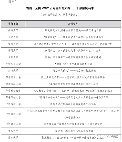 3月5日,全国社会工作专业学位研究生教育指导委员会公布“全国首届MSW研究生案例”大赛三十强案例名单,beat365官网人文与艺术学院社会工作专业硕士申报的《“馨家园”社区营造计划——以“老年人小组”为社区骨干的营造尝试与服务》案例,在学院陈晓东院长、杨明伟老师的精心指导和对案例进行多次研究打磨下,顺利通过首届全国MSW研究生案例大赛初赛第二轮专家评审,入选全国“三十强案例”。