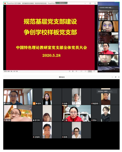 为传达部署学校党委关于基层党支部规范化建设精神,进一步发挥党员先锋模范作用和党支部战斗堡垒作用, 5月28日,中国特色理论教研室党支部在腾讯会议上召开了全体党员大会。