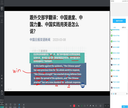 线上直播教学已有四周,徐敏老师说,战“疫”时期的特殊课堂不仅使线下课堂上特别活跃的同学依然保持活力,令人惊喜的是平时比较安静的学生也更多地主动开口参与讨论,相信“云课堂”上积极参与课堂活动的体验会让今后的线下课堂更精彩。