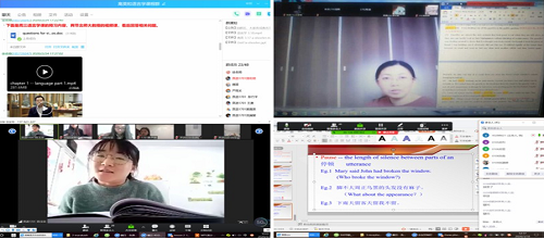 本科专业课:我院专业课大多是小班授课,平时课堂上师生间面对面的互动非常丰富,课堂气氛也十分活跃。疫情下转战在线教学,如何使屏幕后的学生保持同样的专注、积极和高效是英语专业课教师在开课前讨论最多的话题。徐敏老师为自己承担的两门高年级专业课《高级英语II》和《英语语言学概论》制定了与学生进行多渠道交流的教学策略以保证教学效果。首先建立了课程QQ群,用于上传学习资料,布置课前预习内容和课后作业,同时也是随时答疑的渠道。其次她在教学内容和教学过程设计上下了不少的功夫,完善教学课件,利用中国大学MOOC中的精品视频资源作为课前预习与课后拓展的素材,设置问题引导学生观看视频,寻找答案,为课上讨论做好准备。在直播授课中,她充分利用“瞩目”软件的多种功能,通过共享屏幕与学生分享学习内容,用注释功能边讲边写板书或做标记,吸引学生注意力,也易于学生掌握重点和难点;随时与学生连麦提问,检查课前预习情况和听课状态,保证学生的专注和积极参与;打开聊天窗口,与全体学生保持互动并随时解答疑问;开启录课,方便网络信号不稳定的同学自行补课,也为课后复习提供了便利,更使师生有机会回顾和反思自己在课堂上的表现,以弥补不足不断进步