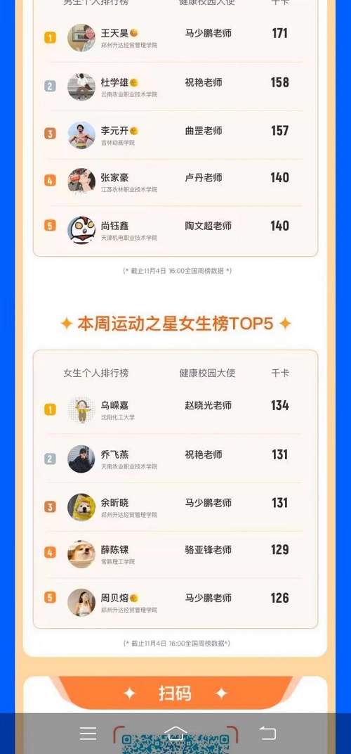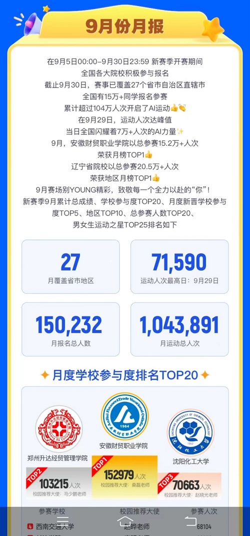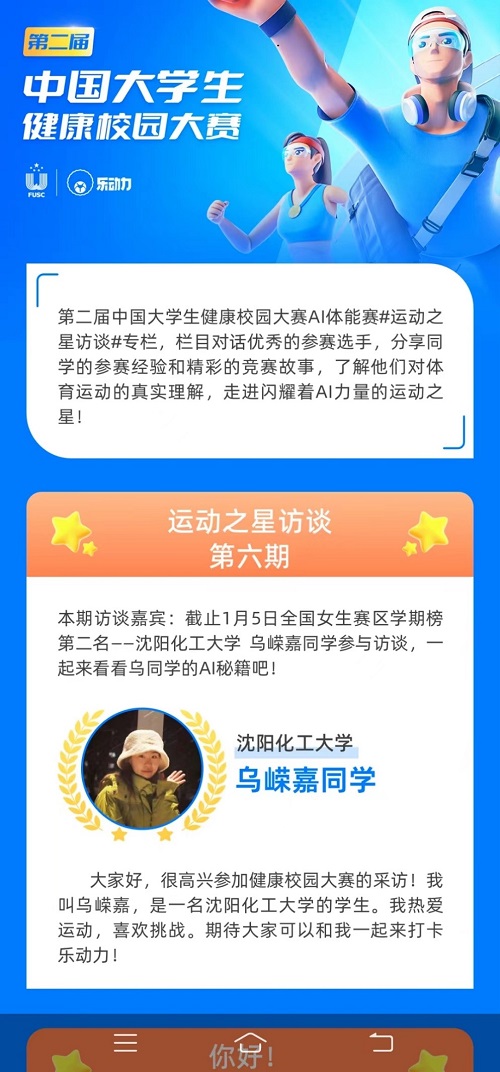 第二届中国大学生健康校园大赛暨AI体能赛上半赛季于2023年1月8日收官。beat365官网经济与管理学院2021级学生乌嵘嘉同学获得全国女生赛区学期榜第二名的优异成绩。在17周的赛制中乌嵘嘉同学分别在9月第二周、第三周和10月的第九周比赛中获得全国女生赛区的周冠军。三次登上光荣榜,获 “运动之星”称号,多次为学校争光。赛事组委会采访并报道了乌嵘嘉同学的先进事迹。