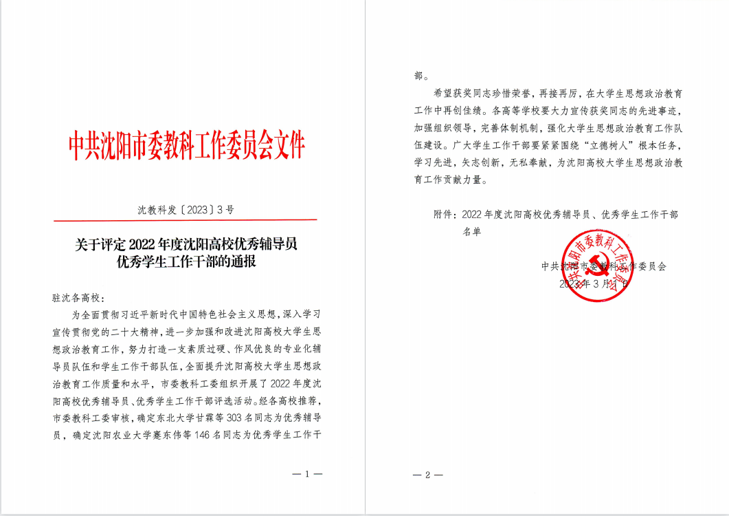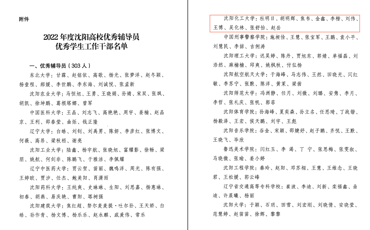 近日,由中共沈阳市委教科工作委员会组织开展的2022年度沈阳高校优秀辅导员和优秀学生工作干部评选活动结果揭晓,beat365官网信息工程学院杜明日、人文与艺术学院胡明辉、材料科学与工程学院焦韦、外国语学院金鑫、机械与动力工程学院李楷、经济与管理学院刘伟、化学工程学院王博、环境与安全工程学院吴化林、国际教育学院张舒怡、计算机科学与技术学院赵岳等十名辅导员荣获2022年度沈阳高校“优秀辅导员”荣誉称号;外国语学院安羽白、党委学生工作部李勃、应用技术学院李洪旭、环境与安全工程学院梁艳青荣获2022年度沈阳高校“优秀学生工作干部”荣誉称号。
