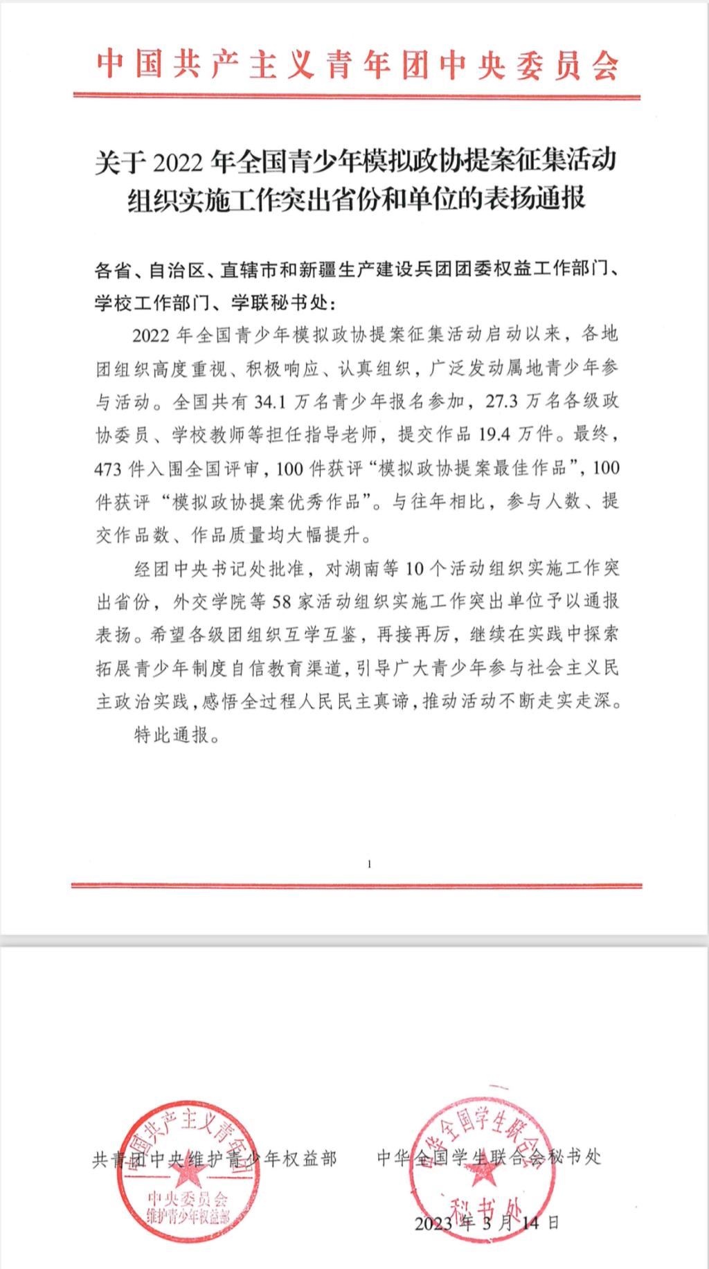 近日,共青团中央维护青少年权益部、中华全国学生联合会秘书处联合下发了《关于2022年全国青少年模拟政协提案征集活动组织实施工作突出省份和单位的表扬通报》,beat365官网荣获2022年全国青少年模拟政协提案征集活动组织实施工作突出单位荣誉称号。