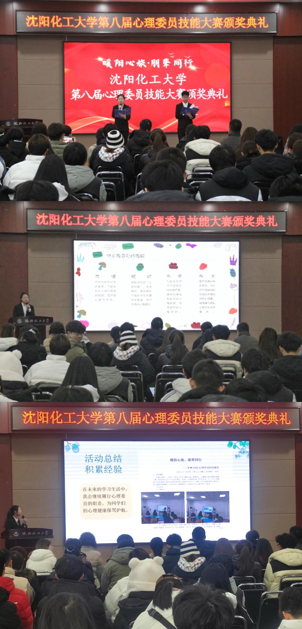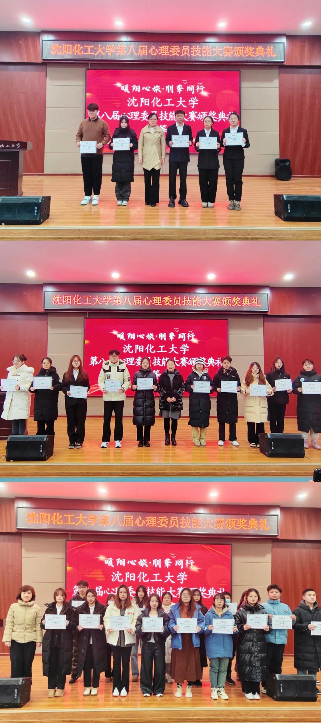 大赛前,心理健康教育中心面向全校2023级心理委员举办4场理论培训与6场实操培训,心理委员的专业技能在此次培训中得以提升。大赛中,2023级心理委员以“暖阳心旅,朋辈同行”为主题,在班级内精心组织开展各类兼具专业性与趣味性的心理健康教育与宣传活动,营造关爱心理健康的和谐氛围,构建积极向上的平和心态。比赛历时一个月,经过各学院的初赛筛选和学校的决赛,评选出一等奖5名,二等奖10名,三等奖20名,优秀指导教师5名。党委宣传部部长刘飞、党委学生工作部部长孟野、党委研究生工作部部长杨海霞、心理健康中心赵彤为获奖同学及教师颁奖。过控2302班杨薪鑫、生物2302班薛雅心同学作为获奖代表分享了工作体会与展望。