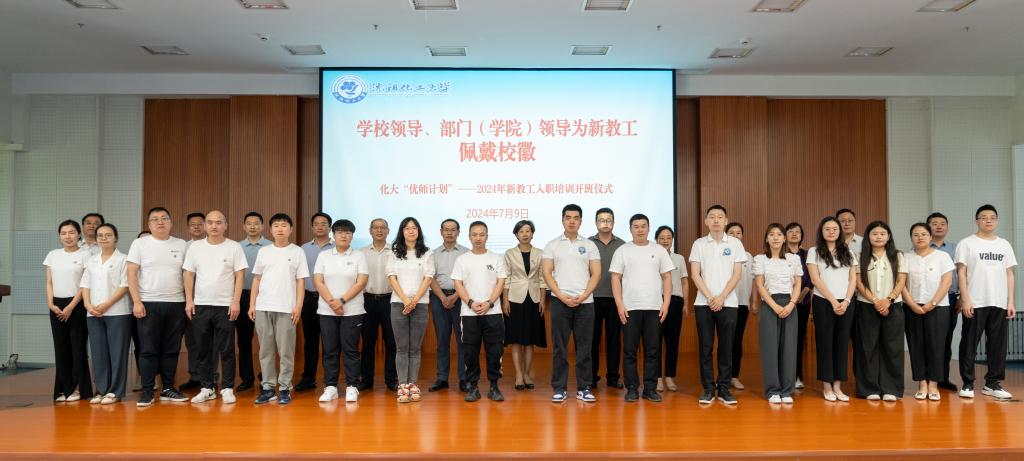 仪式上,党委教师工作部副部长沈玉贵总结2023年新教工入职培训工作,教务处处长、教师发展中心副主任于三三宣读《化大优师计划——2024年新教工入职培训方案》,与会领导为全体新教工佩戴校徽,党委教师工作部副部长孙宏灵带领全体新教工入职宣誓,新教工代表化学工程学院教师王宇桐做了发言。