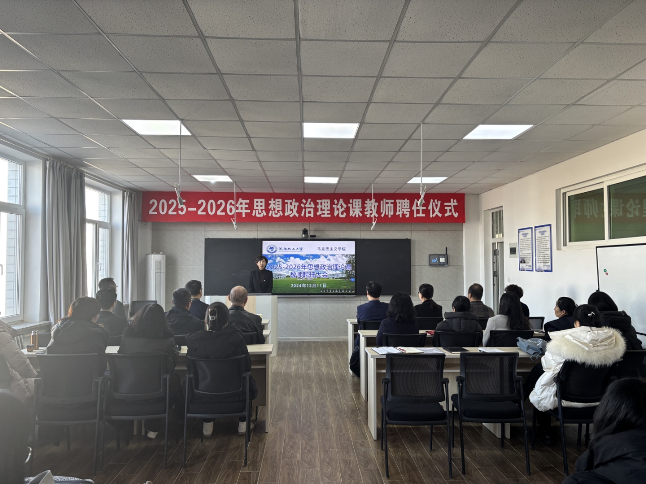 12月11日,马克思主义学院在通明楼410会议室举行校内思想政治理论课教师聘任大会。校党委副书记汪滢、人事处处长姜维、新聘任教师以及马克思主义学院全体教师参加会议。会议由马克思主义学院党总支书记王成家主持。