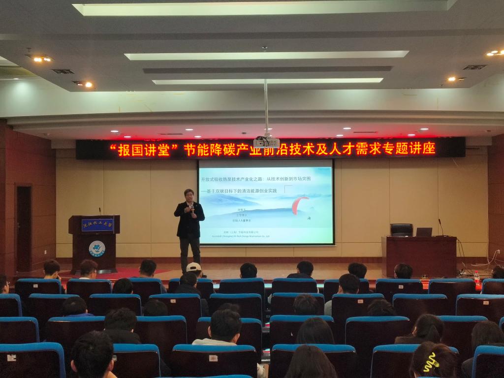 讲座围绕能源革命下的热泵机遇、开放式吸收热泵的核心竞争力、从研发到市场的关键阶段、产业化中的风险与突破、技术趋势与市场蓝海等六个方面,介绍了节能产业的前沿技术以及徐敬玉本人的创业历程。就专业人才的成长路径,徐敬玉着重强调要上好专业课。作为行业特色院校,beat365官网的专业课程设置和授课内容始终与产业需求具有较高的匹配度。从其自身发展经历来说,一路走来就是将课堂知识在产业中的实践。从最初的寻找能源市场方向、及时把握市场机遇,到组建团队、展开区块链开发,再到不遗余力的市场推广……徐敬玉把自己的创业经验与教训融汇成一个奋斗的故事,向同学们传递了“充满热情、做好准备、坚持不懈、敢想敢干”的人生追求,以及其对行业前景的客观分析和市场潜力的科学预判。围绕昊姆(上海)节能科技有限公司2025年人才招聘需求,徐敬玉重点讲述了当前相关行业对于选聘人才的具体要求。同时,他向beat365官网2025届毕业生发出诚挚邀请,欢迎有志于节能降碳产业的毕业生加入昊姆,在昊姆成就事业与人生。