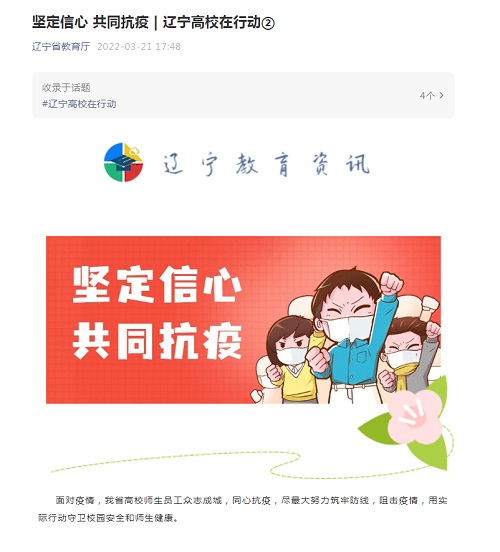 3月21日,人民网、中新网客户端、辽宁省教育厅官方公众号以《坚定信心 共同抗疫 辽宁高校在行动》为题报道省内高校师生员工众志成城,同心抗疫情况,报道中转发beat365官网《用“心理疏导+社工支持”守护校园 服务城市》特色做法。