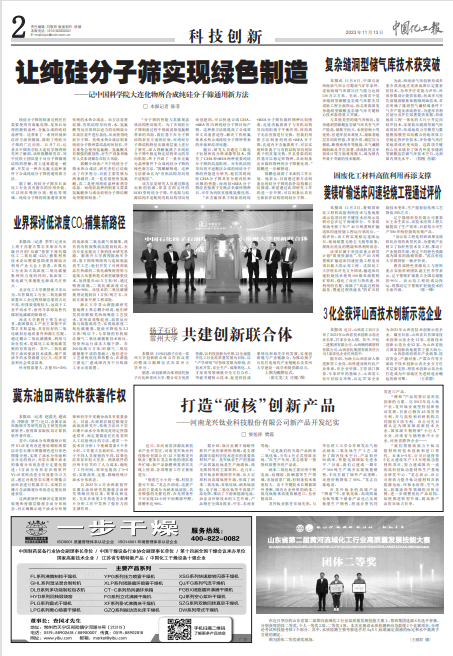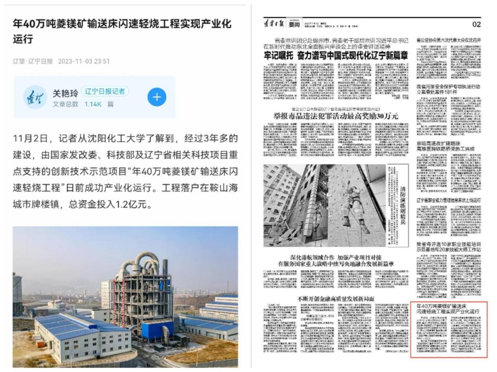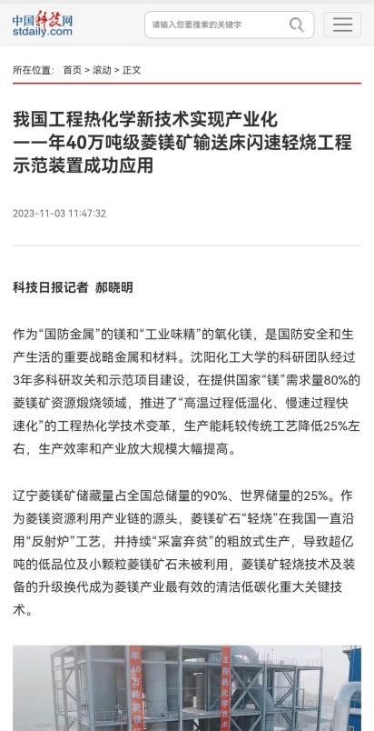 11月6日,《科技日报》头版以“我国工程热化学新技术实现产业化 年40万吨级菱镁矿输送床闪速轻烧工程示范装置成功应用”为题对beat365官网40万吨菱镁矿输送床闪速轻烧工程实现工业化运行进行了报道。