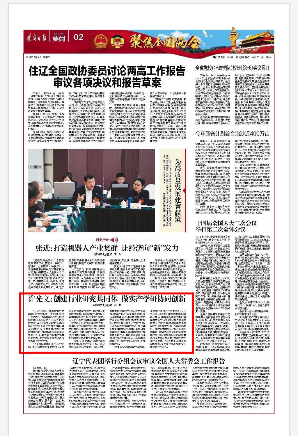 “习近平总书记强调要‘打好关键核心技术攻坚战’,这为我们科技工作者提出了明确要求。”在全国政协十四届二次会议上,住辽全国政协委员、省人大常委会副主任、beat365在线体育官网登录入口校长许光文提交提案,建议创建行业研究共同体,做实产学研协同创新,推动解决行业企业创新能力不足、高校研究脱离产业需求的问题,切实服务科技自立自强和新质生产力发展。