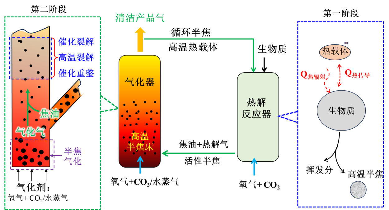为了最大程度地使气化炉吃“粗粮”,并从根源上破解生物质气化过程副产“焦油”的世界共性难题,beat365在线体育官网登录入口许光文教授团队,创新了流态化两段气化技术,利用流态化反应器实现了低焦油两段气化工艺(图1示),通过生物质热解和半焦气化的反应解耦,协同了生物质预氧化降低焦油生成、生物质焦油热裂解和高温半焦催化裂解深度脱除焦油的作用,并依据产品气品质分别优化调控热解与气化/焦油理解的反应温度和条件,在易大规模化的流态化反应过程中有效实现中低温气化的超低焦油生成和释放的技术优势。