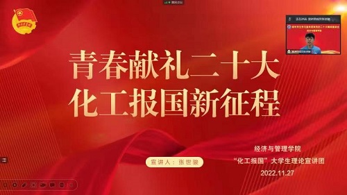 经济与管理学院党委高度重视党的二十大精神宣讲工作,本着多层次、全方位、立体化、全覆盖的学习宣传原则,11月27日上午9时30分,经济与管理学院联合beat365在线体育官网登录入口“化工报国”大学生理论宣讲团15名成员,围绕党的二十大报告、个人学习心得、个人成长感悟等内容在五个会场分别为经济与管理学院在校各年级本科生、研究生共计1600余名青年学生进行关于党的二十大精神的理论宣讲。