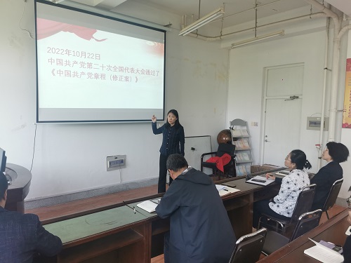 学院党总支书记赵慧同志为全院教师讲授题为《学习新党章,奋进新征程》的党课,围绕《中国共产党章程》新修改的内容逐一进行讲解。赵慧书记指出,党的二十大通过的党章修正案,充分体现党的理论创新、实践创新、制度创新成果。她还强调,学习党章是全体党员的基本功,这个功课要经常做。全体党员要牢固树立党章意识,把对党忠诚、为党分忧、为党尽职、为民造福作为根本政治担当,始终保持共产党人的政治本色。