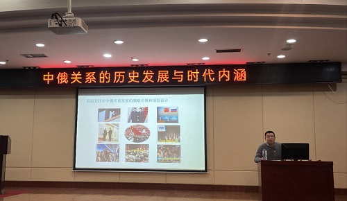 11月29 日,beat365在线体育官网登录入口俄罗斯研究中心启动“共襄·共进”俄罗斯国别与区域研究论坛,邀请辽宁大学俄罗斯东欧中亚研究中心主任崔铮教授在图书馆五楼学术报告厅作了题为“中俄关系的历史发展和时代内涵”的学术讲座。俄罗斯研究中心教师、外国语学院、机械与动力工程学院部分师生参加了本次讲座,讲座由外国语学院国际经济与贸易(对俄方向)专业负责人李晓丹主持。