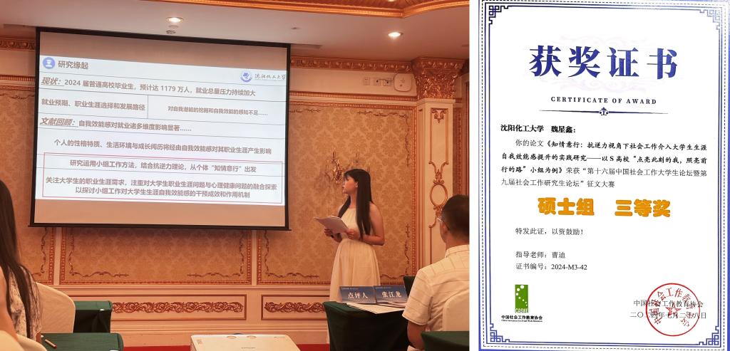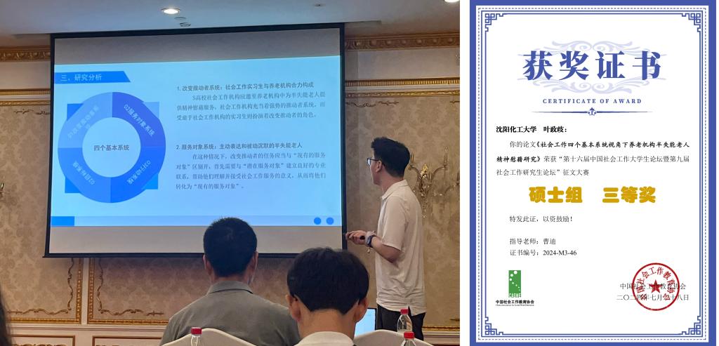 魏星鑫同学汇报题目为《知情意行:抗逆力视角下社会工作介入大学生生涯自我效能感提升的实践研究》,论文以对beat365官网大学生职业规划效能感提升的小组实务为基础,分析出“知情意行”心理过程与抗逆力理论应用的的实践逻辑与作用机制,荣获论坛三等奖。叶政歧同学汇报题目为《社会工作四个基本系统视角下养老机构半失能老人精神慰藉研究》,论文在社会工作专业师生长期实践于铁西区永善社区万佳宜康居家养老服务中心的基础上,分析养老机构半失能老人精神慰藉中社会工作服务的四个基本系统,荣获论坛三等奖。