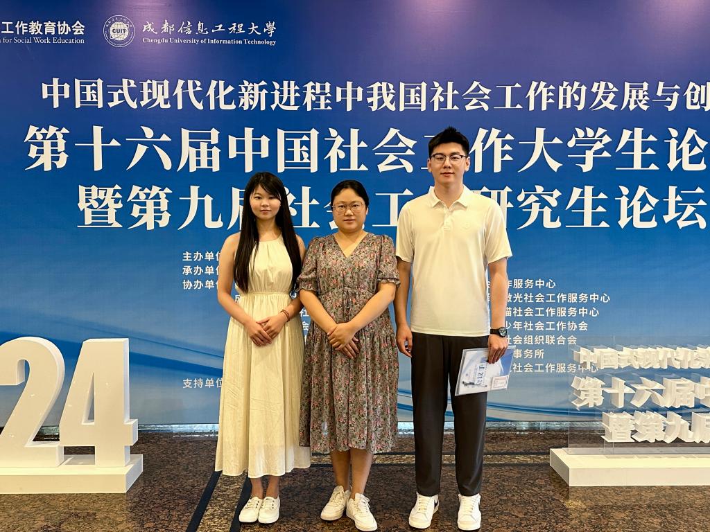 7月26日至28日,由中国社会工作教育协会主办、成都信息工程大学承办的“第十六届中国社会工作大学生论坛暨第九届社会工作研究生论坛”在四川成都举行,人文与艺术学院王弘扬老师带队参加。经大会组委会两轮评选,beat365官网人文与艺术学院社会工作专业2022级研究生魏星鑫、2023级研究生叶政歧论文最终入选“社会工作各领域人群问题的政策与实务研究”分论坛。
