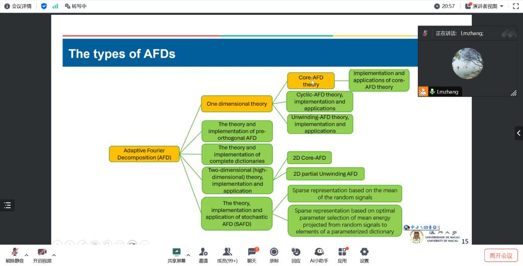 报告会上,张立明教授介绍了澳门原创的一种全新的稀疏表示理论——自适应傅立叶分解(AFD),其使用可解释的希尔伯特再生核预定义字典,并通过自适应选择字典中的原子来实现分解。张立明教授分别介绍了Core-AFD、Cyclic-AFD和Unwinding-AFD等多种技术,其中Core-AFD和Cyclic-AFD均为从低频到高频分解方法,但Cyclic-AFD花费时间较多,提取特征也较多,而Unwinding-AFD从高频进行采样分解,收敛速度快。自适应傅立叶分解其核心技术具有一定的稳定性,有潜力挑战并成为新的国际图像和视频压缩标准。此外,也可用于开发基于再生核的深度网络。