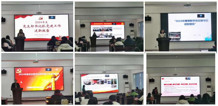 党支部书记吕美横、张晓菲、王欣彦、张成、王春晖、张卓夫分别代表化学第二党支部、化学第一党支部、高等数学党支部、工程数学党支部、物理党支部、学生党支部进行述职。述职内容围绕开展党纪学习教育、增强基层党组织政治功能和组织功能、发挥党员先锋模范作用、落实立德树人根本任务、维护校园安全稳定、以党建引领学院高质量发展、推进全面从严治党等七个方面进行总结汇报,并就上一年党建工作中存在的问题整改情况、今年党建工作存在的问题和改进措施进行分析阐述。