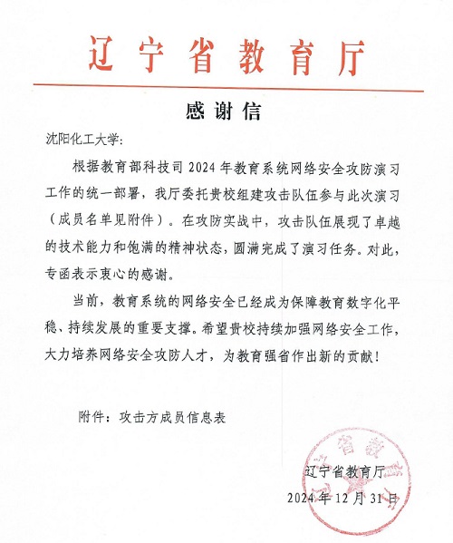 在教育部科技司组织的2024年教育系统网络安全攻防演习中,beat365官网计算机科学与技术学院院长王军教授网络安全团队受辽宁省教育厅委托参加此次演习。在攻防实战中,团队展现了卓越的技术能力和饱满的精神状态,圆满完成了演习任务,并收到了辽宁省教育厅感谢信。