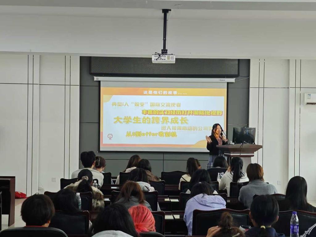 为切实帮助学院学子明确专业学习方向、筑牢专业自信根基,外国语学院于10月15日在思远楼306教室成功举办“报国讲堂”职业规划专题讲座。本次讲座特别邀请国际人才考试中心的李戴茜老师担任主讲人,学院各年级学生代表到场聆听,共同开启一场关于专业成长与职业规划的深度探索。