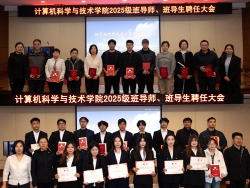 为充分发挥专业教师学业引领作用和学生骨干朋辈示范效应,11月7日,计算机科学与技术学院2025级班导师、班导生聘任大会在图书馆学术报告厅举行。学院党委书记王菲、院长王军、副院长李莉、党委副书记张丽出席,全体2025级班导师、班导生及各专业学生代表共同参与,大会由2025级本科生辅导员肖昊主持。