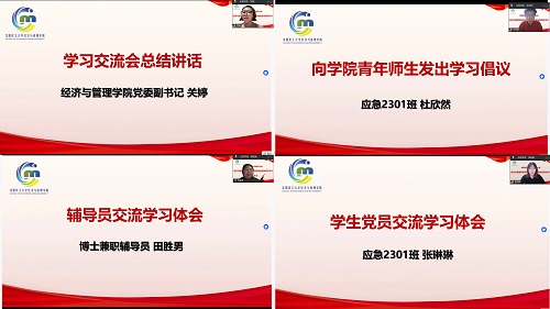 会上,2025级本科生辅导员、本科生党支部书记刘伟介绍了金城龙同志的先进事迹。随后,全体参会人员共同观看了金城龙同志先进事迹相关视频,进一步感悟榜样力量。青年学生代表会计2303班郑惠芷、应急2301班张琳琳结合自身学习生活分享体会;辅导员田胜男从育人工作实际出发,交流学习榜样精神、践行育人使命的思考与感悟。应急2301班杜欣然向全体青年师生发出学习倡议,号召大家以榜样为引领,勇毅前行。