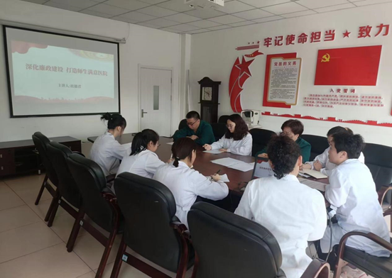 支部书记杜德君在党课中强调了医院廉政工作的重要性和紧迫性,深入阐述了廉洁从医的意义,校医院的医疗卫生服务对象主要为在校师生,行业作风直接影响师生的清廉感受。在医院诊疗中倡廉促廉,开展清廉医院建设,是新时期落实全面从严治党、强化行业监管的一项重大决策。她指出,近年来,校医院始终围绕“党风清正、院风清朗、医风清新”为目标,着力推动清廉医院建设。弘扬清正党风。医院成立以党支部书记、院长为组长的清廉医院建设工作领导小组,明确责任到人。培育清朗院风。制定并完善医德医风考评制度,将医德考评结果与医务人员的晋职晋级、岗位聘用、定期考核等直接挂钩。传承清新医风。以党风廉政建设党课为平台,通过支部书记上廉政党课、观看警示教育片、前往警示教育基地参观学习等方式方法,做好全院职工的廉政学习教育工作。滋养清廉作风。打造红色医院特色文化环境,定期推送重要论述、廉政视频,营造浓厚廉洁文化氛围。打造清暖行风。认真了解患者的就医需求,除了常规诊疗之外还根据患者需要开设了针灸、拔罐、中医护理集一体的诊疗服务。建立化大健康之家微信群,健康之家微信公众号,争当师生的“健康咨询师”。