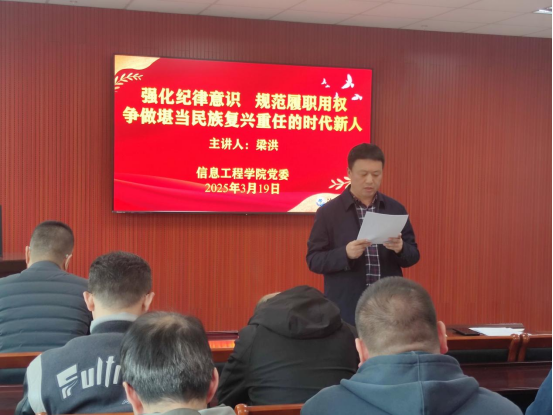 为进一步推进全面从严治党向纵深发展,驰而不息抓好纪律作风建设,切实增强全院教职工遵纪守法和廉洁自律意识,确保党风廉政建设走深走实,3月19日,信息工程学院党委在致本楼317会议室组织召开党风廉政建设工作会议,全院教职工参加会议,党委书记梁洪主持会议并以《强化纪律意识 规范履职用权 争做堪当民族复兴重任的时代新人》为题,为全院教职工讲廉政党课。