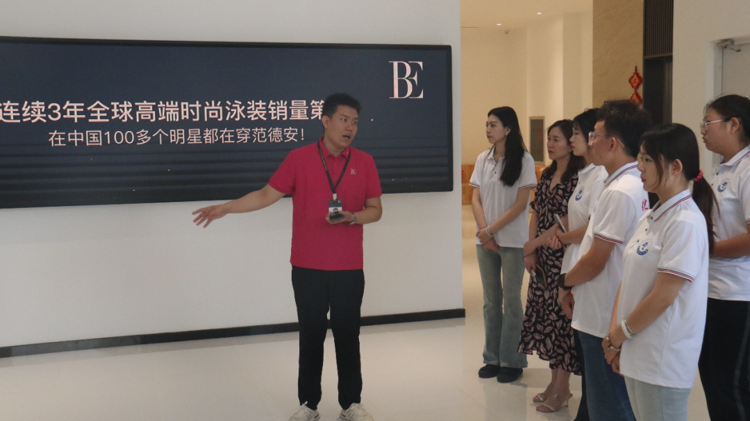 7月17日上午,实践团走访了高端泳装制造企业范德安集团位于兴城市外环西路36号小城品牌园的办公总部。范德安泳装厂作为业内享有盛誉的企业,配备顶级的生产设备,具备精湛的制造工艺。在人力资源部总监杜昊霖的引领下,团队成员知悉了范德安泳装的发展历程、品牌理念及市场定位。师生一行参观了2024泳博会泳装展示厅,走进企业直播大楼,现场感受直播销售和网络运营团队的工作实况。