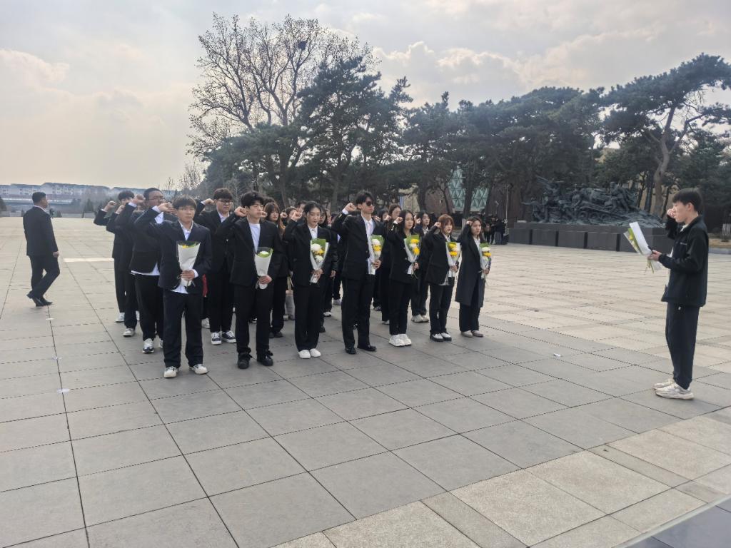 在抗美援朝烈士陵园,全体师生肃立于“抗美援朝烈士英灵永垂不朽”纪念碑前默哀致敬,铿锵地重温入团誓词。随后,学生代表马婧怡在邱少云烈士墓前动情讲述其烈火焚身仍岿然不动的壮烈事迹;学生代表李光耀讲述赵铁柱烈士以身躯堵枪口用生命开辟冲锋道路的英勇事迹。同学们手捧白菊献于墓前,凝视烈士纪念墙上密布的名字,聆听无声的历史回响,深刻体悟英雄用生命铸就的精神丰碑。
