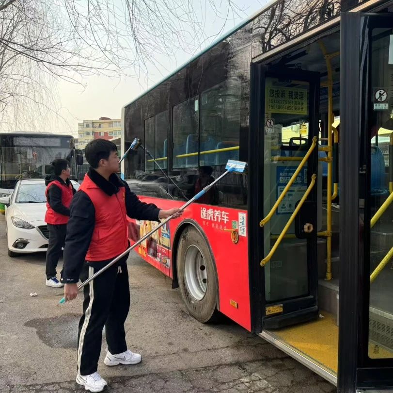 青年突击队队员们着重对公交车的窗户进行清洁工作。在整个活动过程中,志愿者们热情高涨,积极协作,展现了当代大学生良好的精神风貌和强烈的社会责任感。
