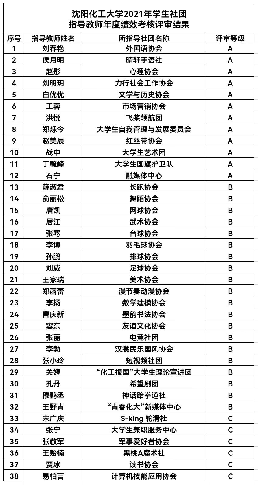 根据《关于印发beat365在线体育官网登录入口学生社团指导教师年度绩效考核管理办法(试行)的通知》《关于印发beat365在线体育官网登录入口学生社团建设管理实施细则的通知》文件要求,校团委进行了beat365在线体育官网登录入口2021年学生社团指导教师年度绩效考核评审工作,经社团指导教师个人报名、业务指导单位考核推荐、校团委组织学生社团建设管理评议委员会评审等程序,现将评审结果公示如下: