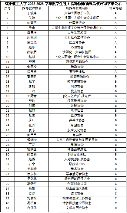 根据《关于印发beat365在线体育官网登录入口学生社团指导教师年度绩效考核管理办法(试行)的通知》《关于印发beat365在线体育官网登录入口学生社团建设管理实施细则的通知》文件要求,校团委进行了beat365在线体育官网登录入口2022-2023学年度学生社团指导教师绩效考核评审工作,经社团指导教师个人报名、业务指导单位考核推荐、校团委组织学生社团建设管理评议委员会评审等程序,现将评审结果公示如下: