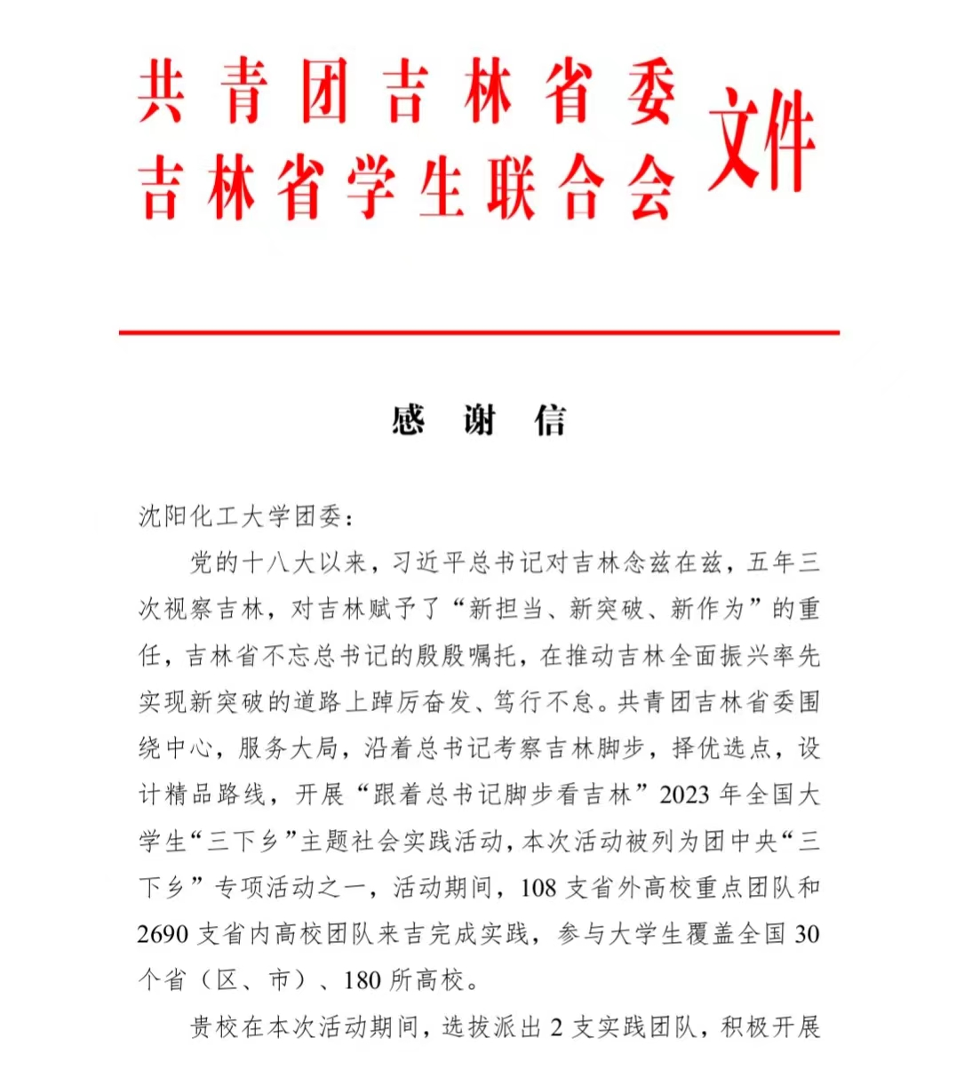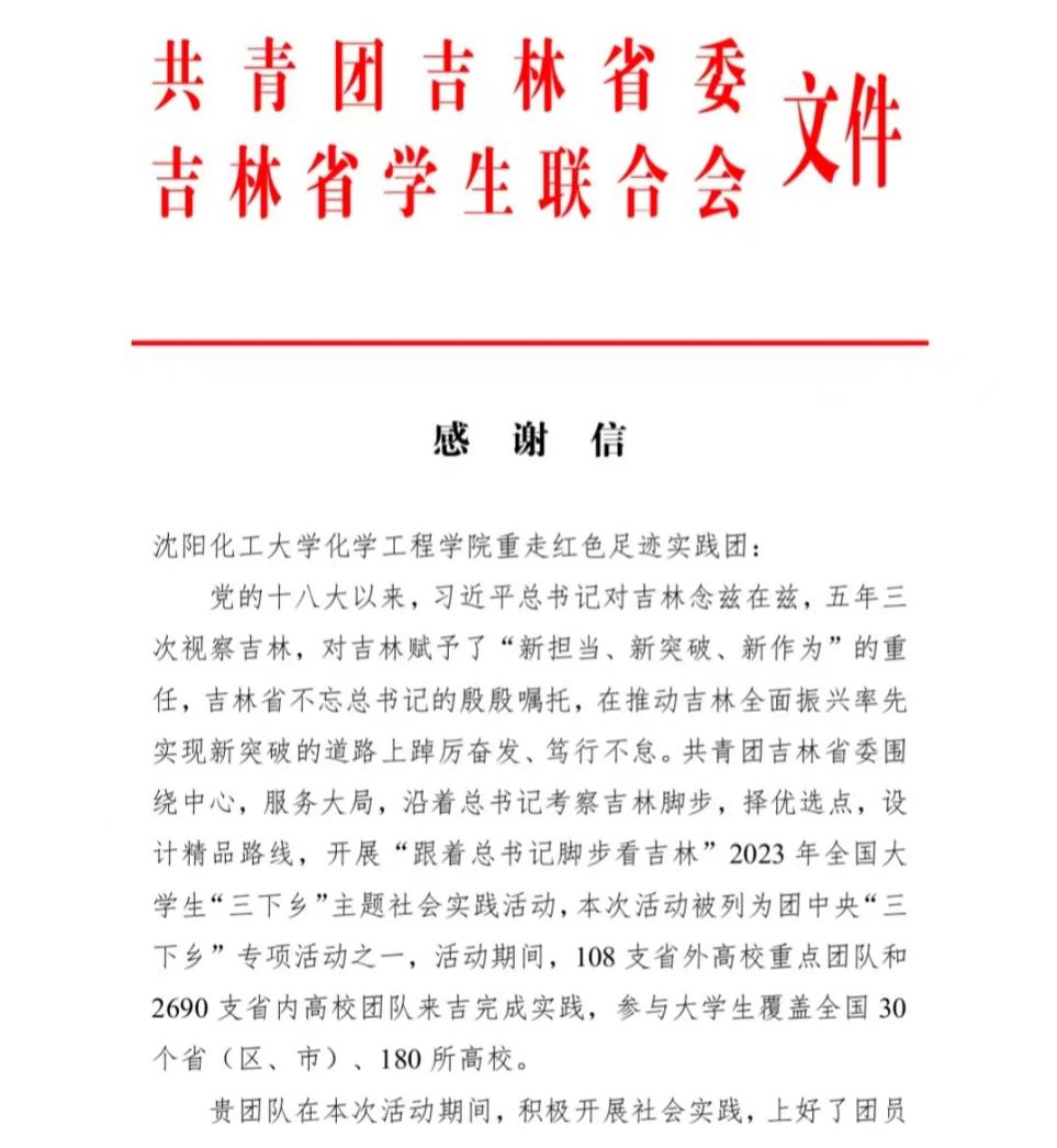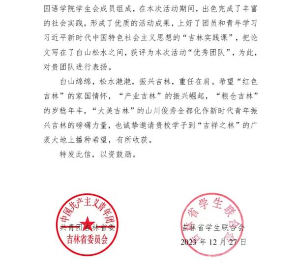 “跟着总书记脚步看吉林”社会实践团收到感谢信