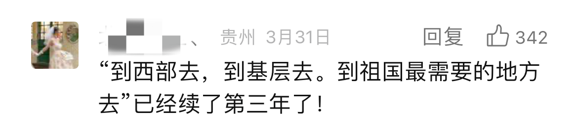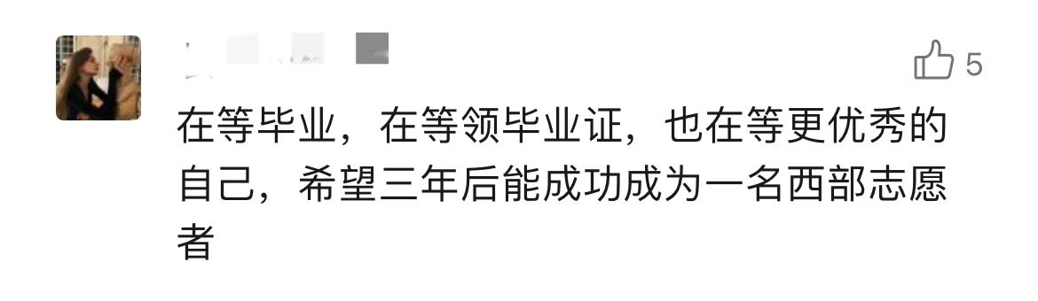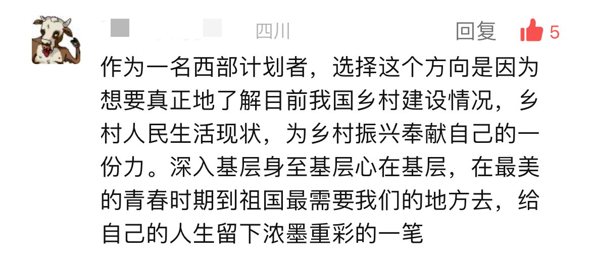 打开留言区,这群年轻人澎湃滚烫的“热情怀”溢出屏幕。“读书16年,我想是时候去做一件这样的事了。”“在党和国家的帮助下我才实现了大学梦,我也想以实际行动回报党和国家”“我的家乡就在西部,想把大山外的世界带给大山里的每一朵小花儿,给祖国的西部种满星星”……“家国所系,我之所行”。我们不难发现,这些字里行间流露出的强烈爱国情感和社会责任感,正是这群年轻人毅然决然报名西部计划的强大“源动力”。