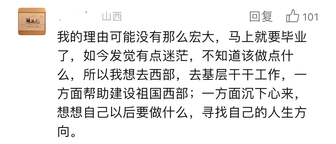 从留言中我们不难看到,这群年轻人理智规划的“冷思考”。“我的理由可能没有那么宏大,马上就要毕业了有点迷茫。我就是想在从学校到社会这个跨度中,有机会切实感受基层工作内容,在实践中寻找自己的人生方向,做出人生更准确的选择”“选择西部计划是因为想要真正地了解目前我国乡村建设、乡村人民生活现状,出一份力”“我的愿望很宏伟,建设更加美好的祖国。但我的能力很渺小,所以我想在西部计划一个基层岗位上慢慢付出”…… 透过这些文字,我们仿佛能看到这群即将走出“象牙塔”站在人生十字路口的年轻人正在认真思考“我要成为什么样的人?”“党和祖国需要什么样的我?”。