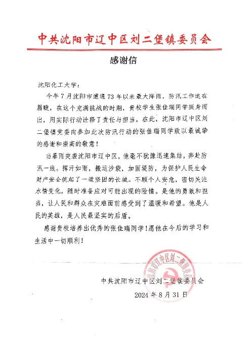 在今年7月,沈阳遭遇73年以来最大降雨,防汛工作迫在眉睫,沈阳市面临着前所未有的洪水挑战。在这一紧急关头,beat365在线体育官网登录入口机械与动力工程学院张佳瑞同学用实际行动诠释了化大学子、共青团员的责任与担当,展现了当代大学生的风采与魅力。