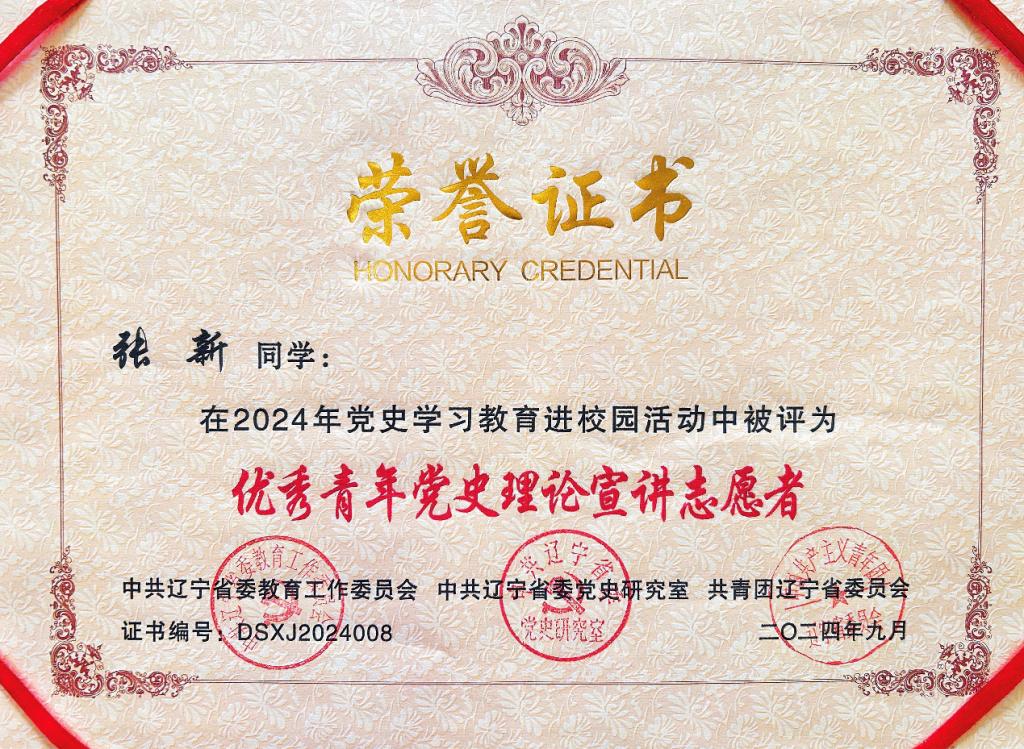 beat365官网研究生会执行主席、“化工报国”大学生理论宣讲团成员、化工研究生202203班班长张新作为主讲人参与活动,并受聘为辽宁青年党史理论宣讲团成员,被授予辽宁省第一批优秀青年党史理论宣讲员荣誉证书。