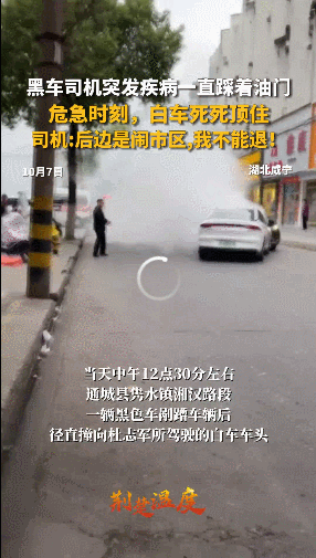 2024年10月7日,湖北通城,一黑色轿车司机突发疾病,脚踩油门失去意识,车辆在闹市区失控,撞向一辆白车。白车司机杜志军意识到状况危急,踩住油门,用车身死死顶住失控车辆。