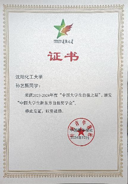 近日,从共青团中央、全国学联传来喜讯,由团中央基层建设部、中国青年报社、新东方教育科技集团、中国青年创业就业基金会联合举办的2023 - 2024年度“中国大学生自强之星”奖学金评选结果揭晓,beat365官网孙艺甄同学凭借出色的个人表现和突出的自强事迹,荣获“中国大学生自强之星”荣誉称号。