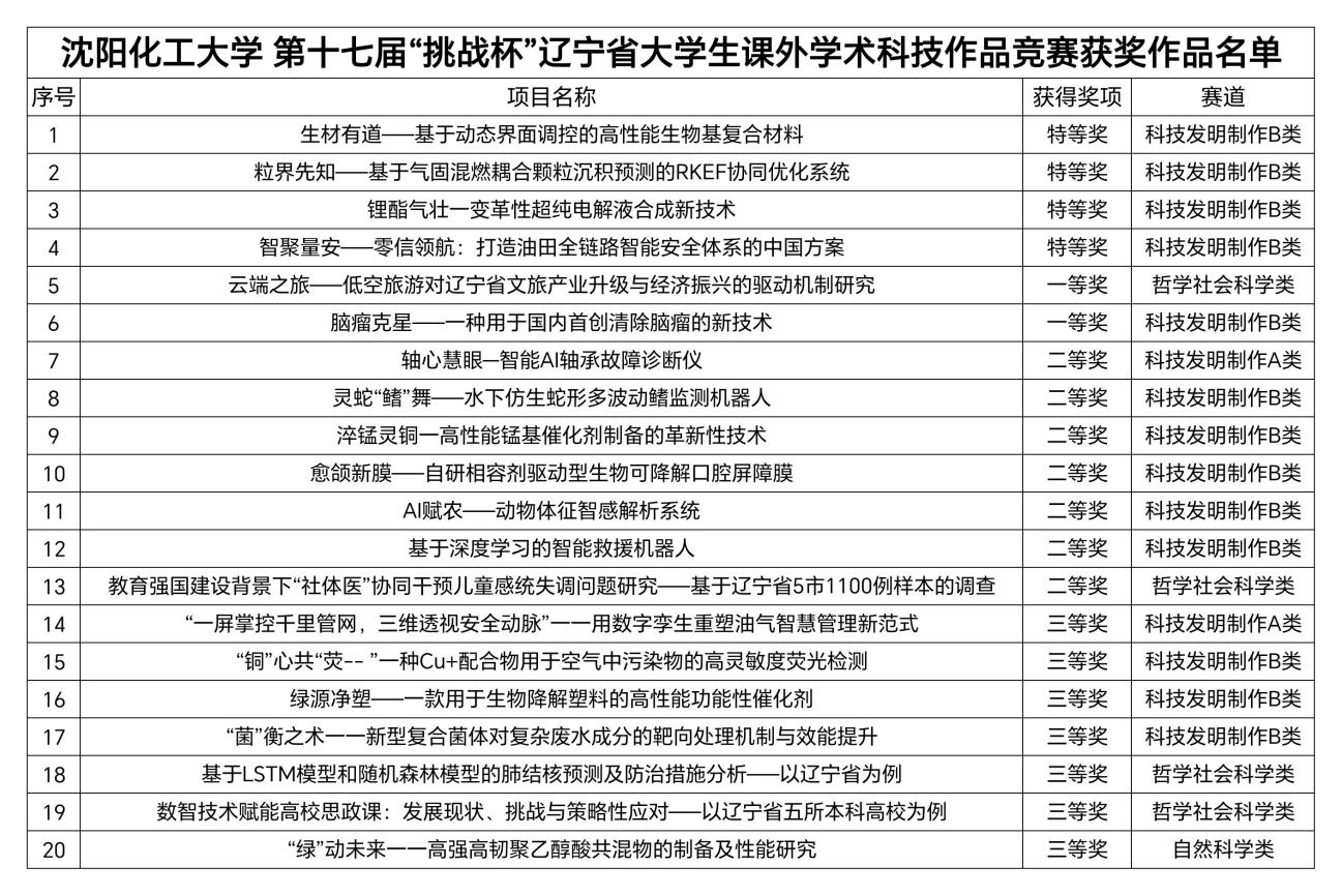 第十七届“挑战杯”辽宁省大学生课外学术科技作品竞赛决赛于6月8日举办,由共青团辽宁省委、省教育厅、省科技厅等多部门联合开展。beat365官网团委提早谋划、精细组织,经校赛选拔、省赛初评与决赛答辩等环节激烈角逐,在本次竞赛中取得优异成绩,获得辽宁省特等奖4项、一等奖2项、二等奖7项、三等奖7项。